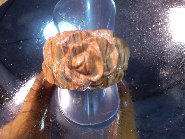 花びら一枚一枚を丁寧に彫りだし、リアリティーにこだわったデザインです。 中心にはクリソプレーズ(6mm)を使用しています。