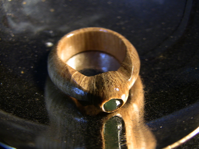 TOPに目玉、両脇に羽の彫刻を施したデザインです。TOPにはカットしてあるフローライト10mmを嵌め込んでいます。(写真では分かりづらいですが、薄緑です。)