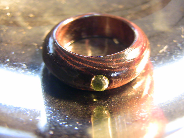 TOPにペリドットを嵌め込んだシンプルなデザインになっています。(木固めエース使用。) 防水性あり。