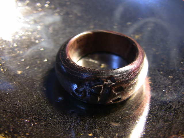 虚空像菩薩(こくぞうぼさつ)の梵字を彫りこみ、お守り的な指輪になっています。 (木固めエース使用。) 防水性あり。